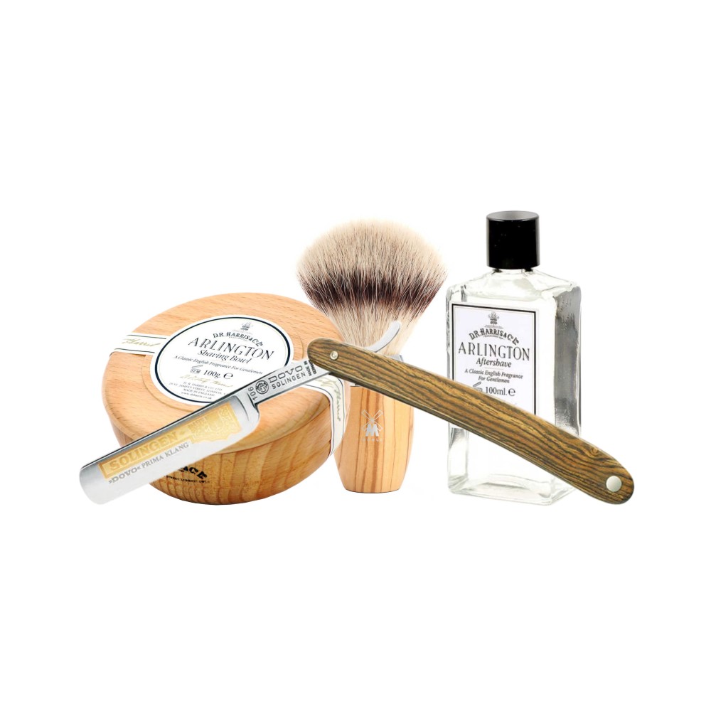 Rakkniv från Dovo, Rakborste från Mühle, Raktvål och aftershave från D.R Harris Arlington serie.