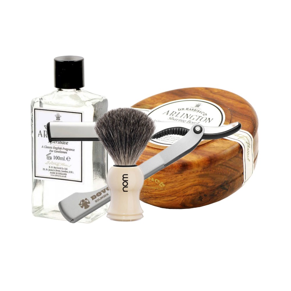 Shavetteset som innehåller raktvål och aftershave från D.R. Harris Arlington serie. Dessutom en shavette från Dovo och en rakborste från Nom.